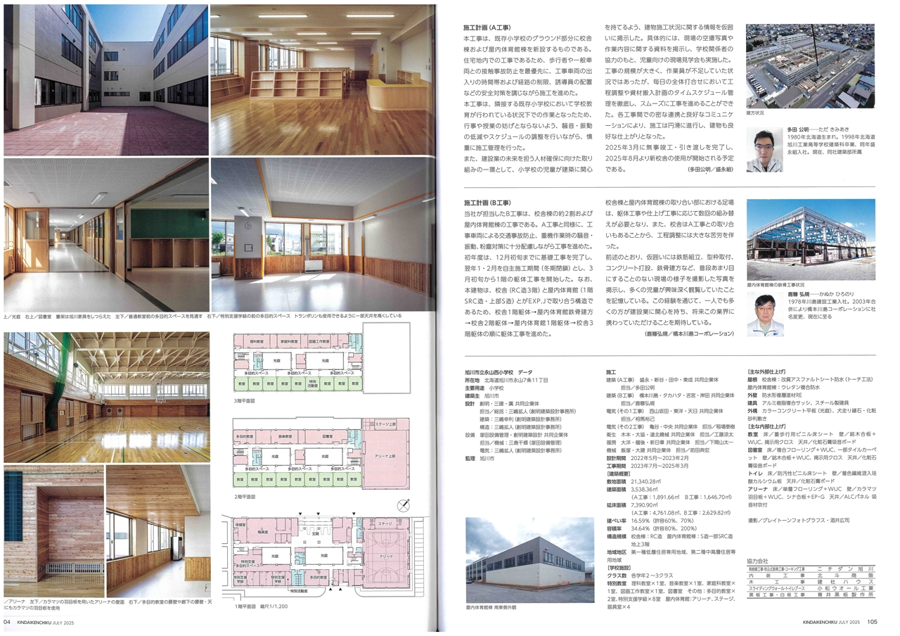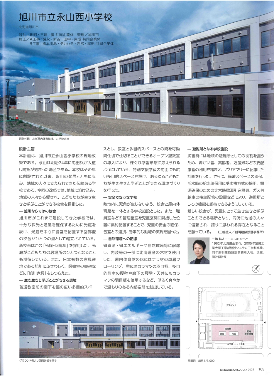 近代建築 2025年7月号(特集 学校建築 共創の学校づくり)の103~105ページに弊社副社長が設計・統括した「永山西小学校」の記事が掲載されました。